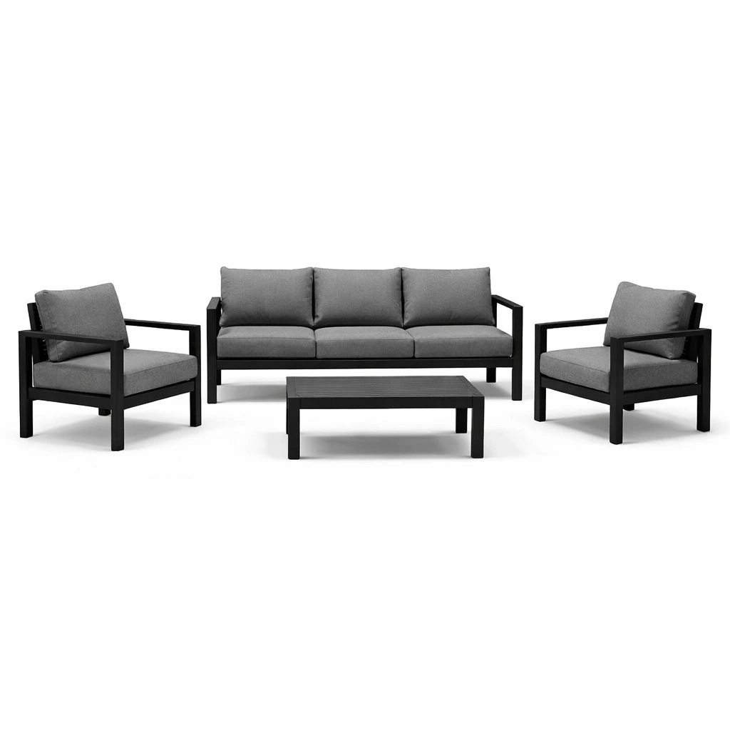 - 1 sofá, 2 sillones, 1 mesa de centro, cojines incluidos.